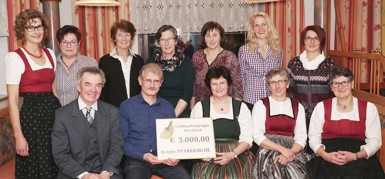 "Der Vorstand hat im Namen aller Mitglieder der Goldhaubengruppe an die Pfarre eine Spende von € 3.000,00 für die Innrenovierung der Kirche übergeben". Vergelt´s Gott !
